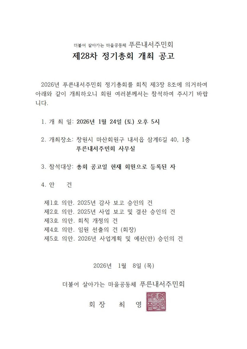 [공지] 제28차 푸른내서주민회 정기총회 안내
